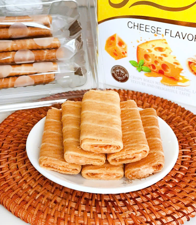 Mô tả chi tiết: Dòng chữ tiếng Anh mô tả: "CRISPY ROLLS WITH FRAGRANT AND MELLOW CHEESE TASTE" (Bánh cuộn giòn với hương vị phô mai thơm và đậm đà).