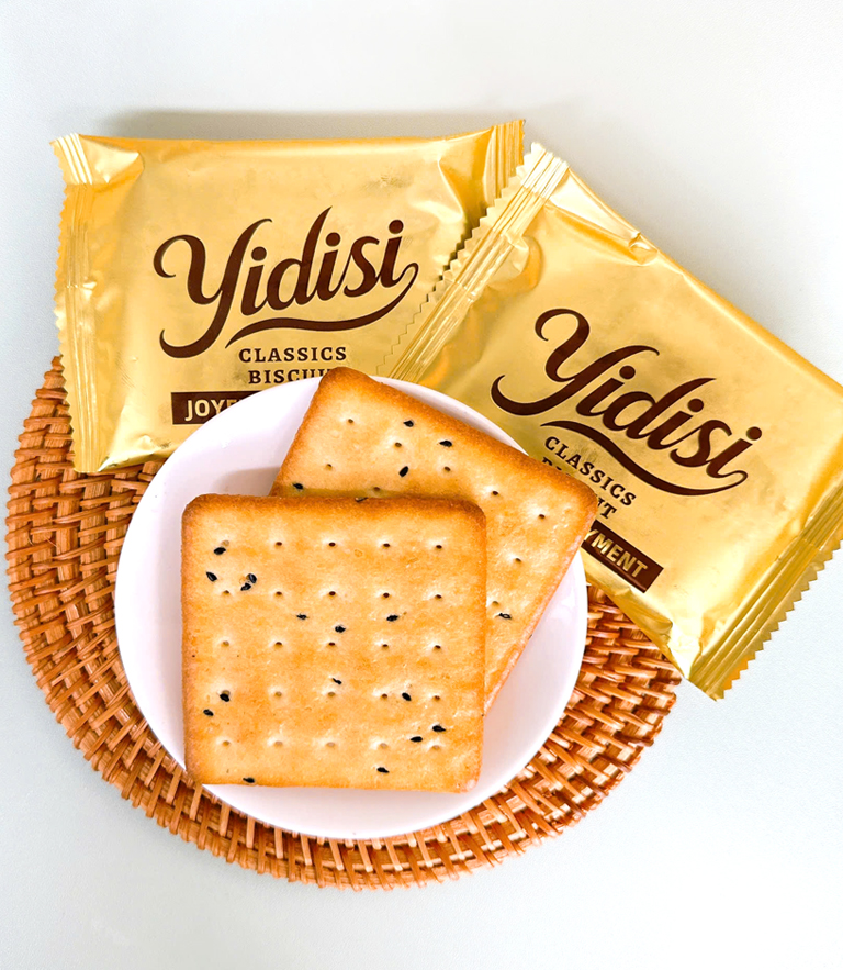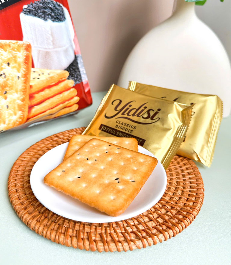 Dòng sản phẩm bánh quy giòn (Soda Biscuits) của Yidisi mang đến trải nghiệm ăn vặt nhẹ nhàng, giòn xốp với ba hương vị béo ngậy, mặn mà đặc trưng. Bánh được đóng gói tiện lợi, lý tưởng để dùng kèm trà hoặc cà phê.