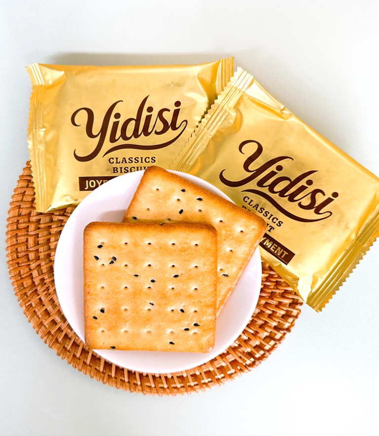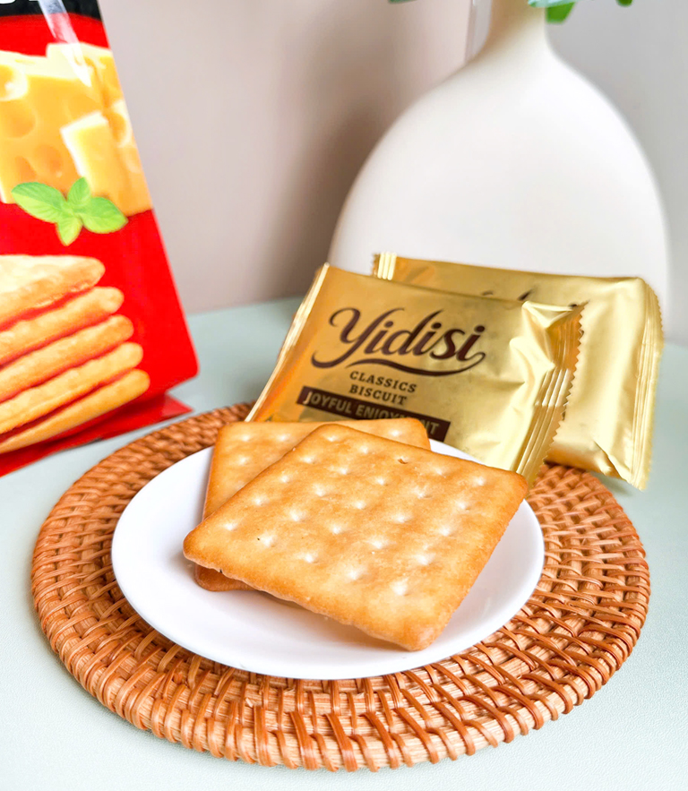 Dòng sản phẩm bánh quy giòn (Soda Biscuits) của Yidisi mang đến trải nghiệm ăn vặt nhẹ nhàng, giòn xốp với ba hương vị béo ngậy, mặn mà đặc trưng. Bánh được đóng gói tiện lợi, lý tưởng để dùng kèm trà hoặc cà phê.