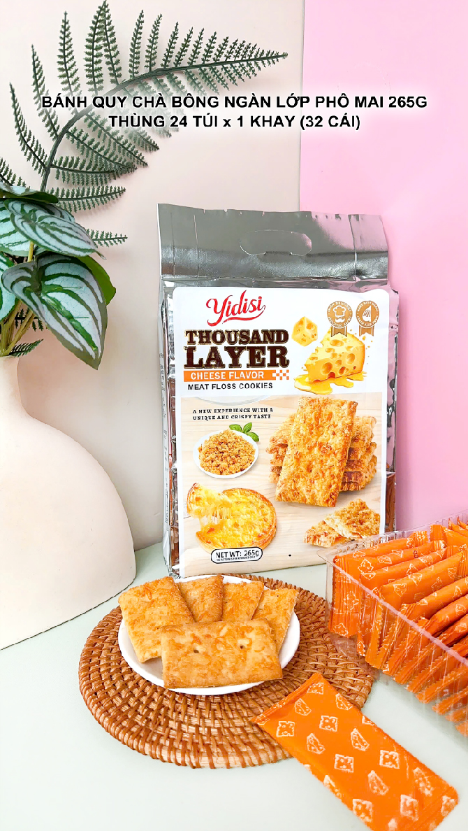 Bánh quy Ngàn Lớp Yidisi là một dòng bánh mặn cao cấp, gây ấn tượng mạnh mẽ với cấu trúc siêu giòn, xốp nhẹ nhờ công nghệ nướng nhiều lớp đặc trưng, kết hợp với các hương vị mặn béo hấp dẫn.