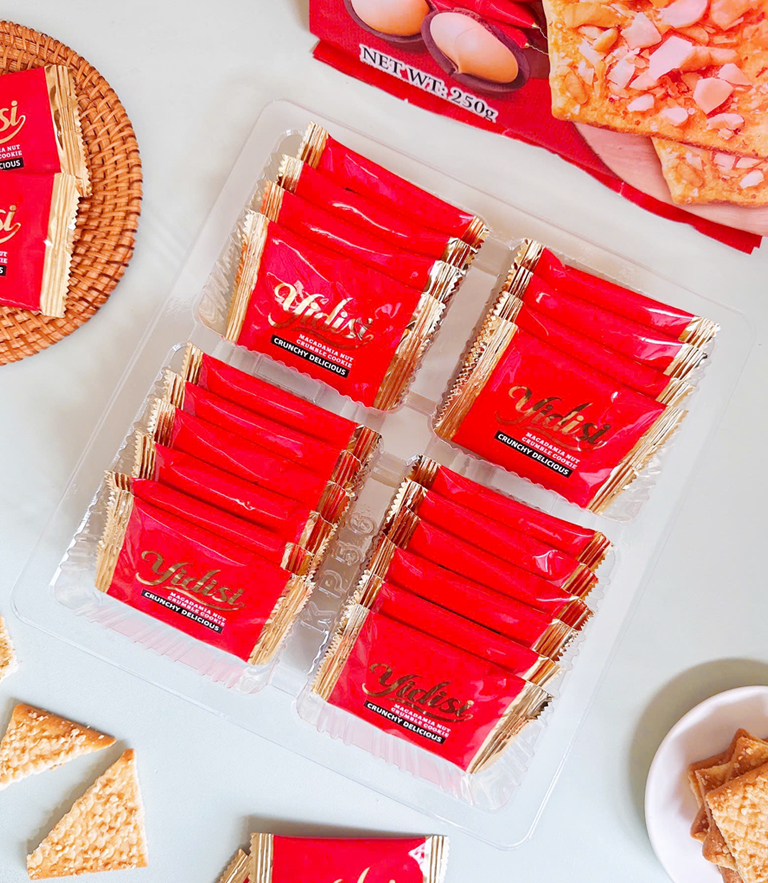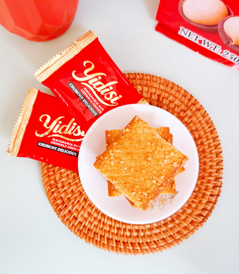 Bánh quy giòn YIDISI có các thành phần chính như phô mai, đậu phộng, matcha và trứng/hạt.