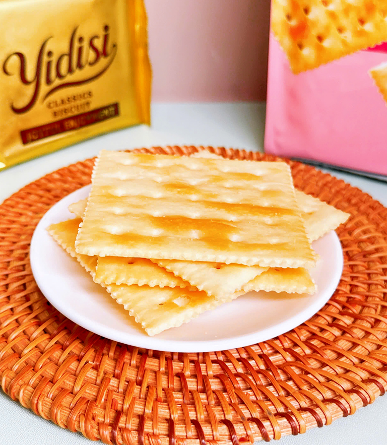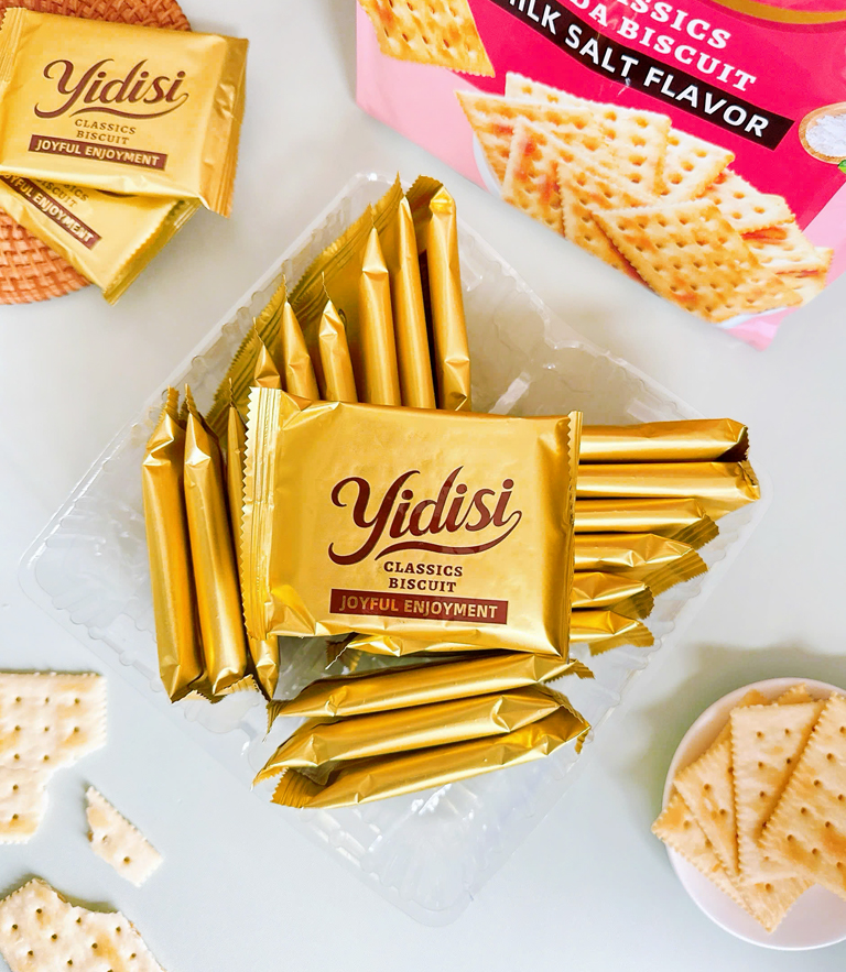 Dòng bánh quy soda cổ điển của Yidisi mang đến sự kết hợp hoàn hảo giữa độ giòn xốp và hương vị mặn ngọt tinh tế, lý tưởng cho những người thích ăn vặt nhẹ nhàng, ít béo.